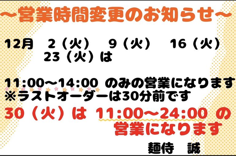 12月の火曜日営業時間変更のお知らせです